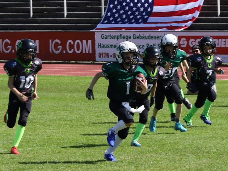 Ein weiterer Grund ist, dass unser Team in beiden Spielen eine Super-Leistung gezeigt hat. Im Gegensatz zu einigen gegnerischen Teams wechseln die Coaches der Shamrocks immer wieder durch, d.h. jedes Kind kommt auch wirklich zum Einsatz. Und so kam es dann auch, dass jedes unserer Kinder mindestens eine Super-Aktion zeigen konnte - Touchdowns durch die Luft und über den Boden, abgewehrte Pässe der Gegner und richtig gute Tackles waren nur einige Beispiele.